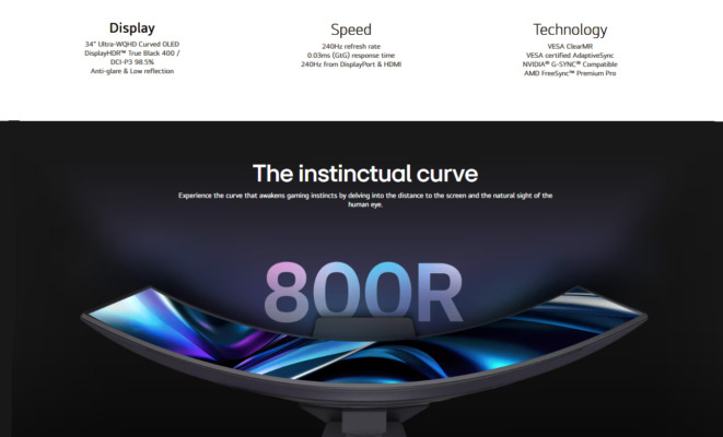 - 34″ Ultra-WQHD (3440 x 1440) 21:9 800R Curved OLED